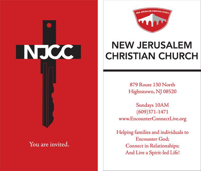 2x3.5 inch business card design for the New Jerusalem Christian Church. The concept was to have a youthful yet bold and clear message; wherein this case the standard Christian cross is shaped to resemble a door key, to represent Jesus Christ as the key to the kingdom of God. The red background being a representation of his blood that cleanses sins.